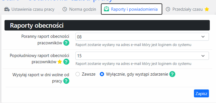 Rozumiemy, że każda organizacja ma unikalne potrzeby, dlatego zapewniamy możliwość konfiguracji godziny otrzymywania raportu. W zakładce „Raporty i powiadomienia” w Konfiguracji/Ustawieniach czasu pracy, użytkownicy mogą ustawić preferowaną porę dostarczania raportu porannego. Dla użytkowników wersji PRO udostępniamy również opcję raportu popołudniowego, co zapewnia jeszcze większą elastyczność i kontrolę nad zarządzaniem zespołem.